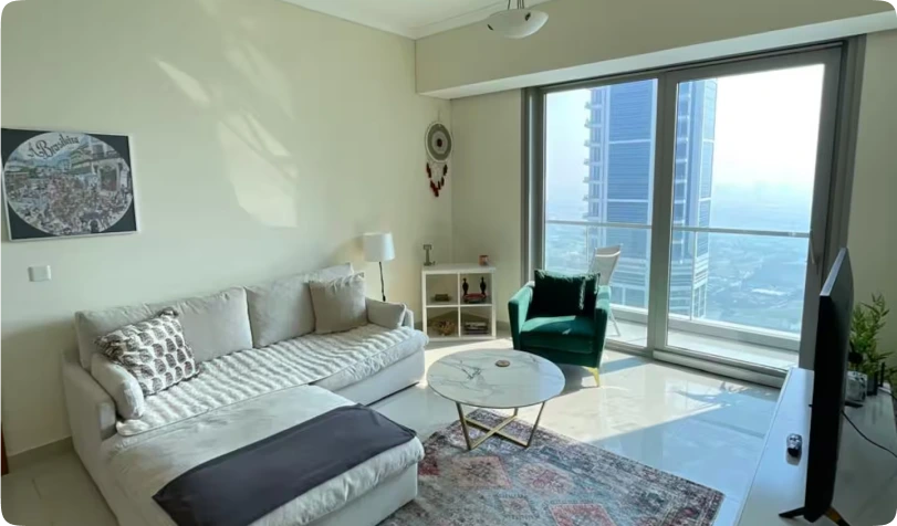 Experience stylish living in a high-floor apartment with breathtaking views of Dubai.